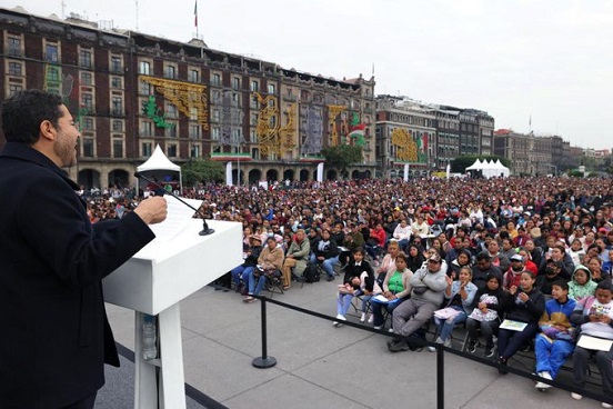 «En la Ciudad de México no puede haber un niño que tenga beca y otro que no la tenga en el mismo salón de clases. No puede haber esa discriminación ni desigualdad», expresó el Jefe de Gobierno durante la entrega simbólica de las últimas 20 mil tarjetas del programa, que otorga apoyos económicos para estudiantes de preescolar, primaria y secundaria. Este programa también incluye ayudas para uniformes, útiles escolares y seguro médico.