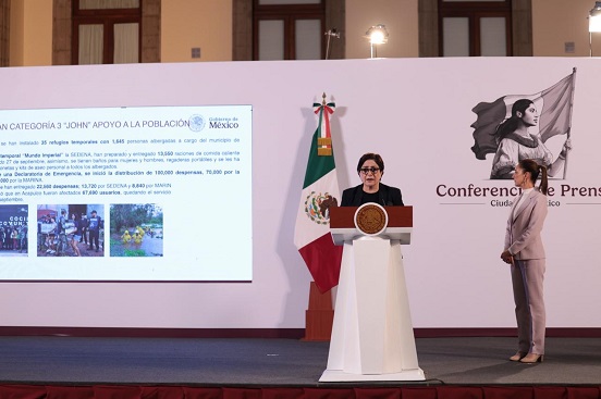 Ante el embate de John, 985 elementos de las Fuerzas Armadas desalojaron a más de 10,000 personas y en el sur de Guerrero aún hay 35 refugios con 1,645 ciudadanos, indicó la titular de Protección Civil.