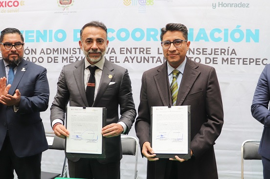METEPEC, Estado de México.- Jesús George Zamora, Consejero Jurídico del Estado de México, y Fernando Flores Fernández, Presidente Municipal de Metepec, firmaron un convenio para la realización de operativos conjuntos a fin de constatar que las unidades económicas operen bajo los lineamientos que establece la reglamentación vigente.