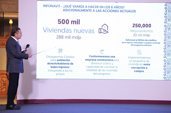 En la conferencia matutina de Claudia Sheinbaum Pardo, el titular del Infonavit destacó que del millón de viviendas a construir, 500 mil viviendas nuevas estarán a cargo del Infonavit, mientras que la otra mitad, estará a cargo de la Comisión Nacional de Vivienda (Conavi) y el Fovissste.
