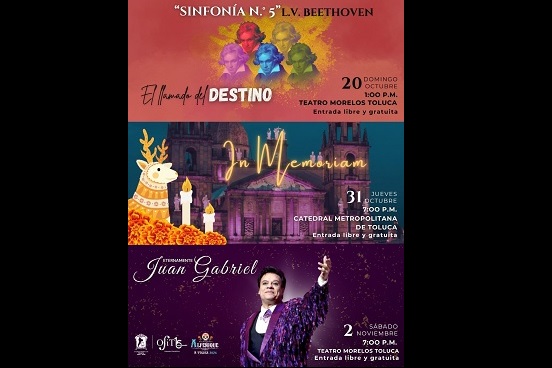 Estos espectáculos de la fiesta más importante de Toluca comienzan el domingo 20 de octubre a las 13:00 horas en el Teatro Morelos con la Sinfonía N.° 5 de Beethoven El llamado del destino, un concierto de emoción e historia que conquistará el corazón del público.