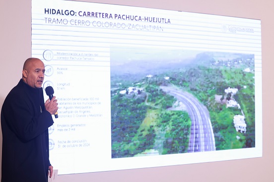 Informó que, en Hidalgo, el tramo Cerro Colorado-Zacualtipán, de la carretera Huejutla-Pachuca, registra 99 por ciento de avance y estará concluida el 31 de octubre, mientras que el tramo Real del Monte-Entronque Huasca de la misma carretera, presenta 87 por ciento de avance y estará terminado el 20 de enero de 2025.