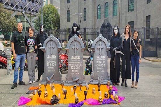 En el marco del Día de Muertos, organizaciones de la sociedad civil se reunieron a las afueras de la Secretaría de Salud para montar un altar en memoria de los fallecidos por el consumo de productos nocivos para la salud: tabaco, alcohol, productos ultraprocesados y bebidas azucaradas.