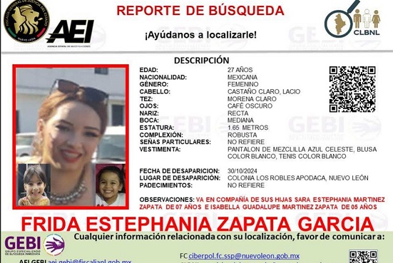 El estado de Nuevo León se encuentra en alerta tras la desaparición de una joven madre y sus dos hijas pequeñas. Las autoridades han emitido un reporte de búsqueda para localizar a Frida Estephania Zapata García, de 27 años, quien desapareció el pasado 30 de octubre en la colonia Los Robles, en el municipio de Apodaca.