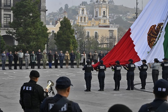 La Mandataria estatal encabezó la ceremonia de izamiento y honores al lábaro patrio en la Plaza de los Mártires en la ciudad de Toluca. Estuvo acompañada de Secretarias y Secretarios del Gabinete Estatal; así como de las autoridades que conforman la Mesa de Coordinación para la Construcción para la Paz.