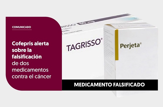 La Comisión Federal para la Protección contra Riesgos Sanitarios (Cofepris) alerta sobre la falsificación y comercialización irregular de dos medicamentos empleados en el tratamiento de tipos específicos de cáncer: Perjeta (pertuzumab) solución 420 mg/ 14 mL (30mg/mL) y Tagrisso (osimertinib) 80 mg.