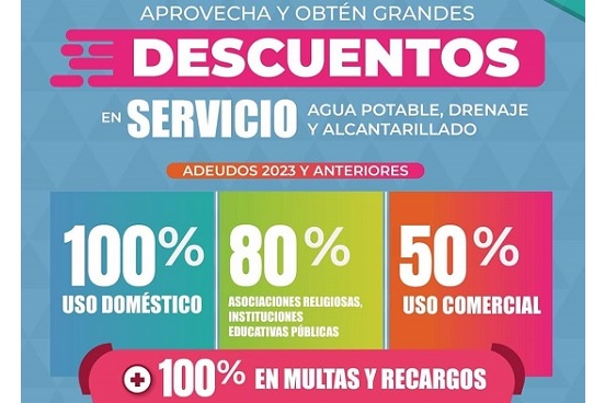 Durante la campaña, los usuarios podrán regularizar sus adeudos de agua potable, drenaje y alcantarillado, obteniendo 100% de descuento en el servicio, multas y recargos de uso doméstico. Las asociaciones religiosas e instituciones educativas públicas podrán ser acreedoras al 80% de deducción y los usuarios de uso comercial hasta 50%.