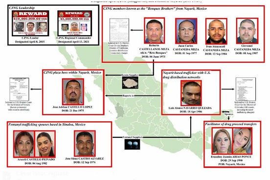 “El CJNG es una organización de tráfico violenta establecida en México responsable por una importante porción del fentanilo y otras drogas traficadas en los Estados Unidos. La acción de hoy subraya nuestro compromiso de señalar a las redes de proveedores y facilitadores que permiten el flujo ilícito de drogas letales hacia los Estados Unidos, poniendo en peligro las vidas de nuestros ciudadanos»