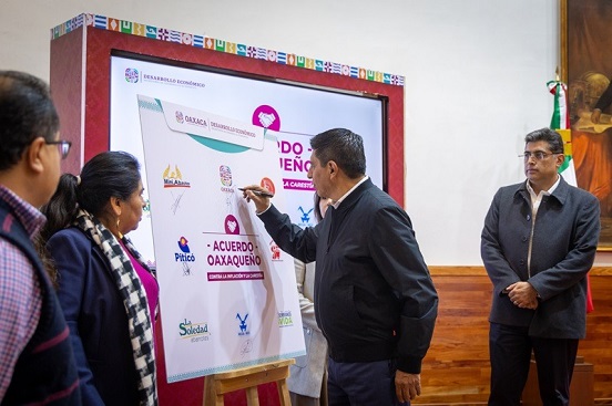 Oaxaca de Juárez, Oax.- En un esfuerzo conjunto por apoyar la economía de las familias, el Gobernador Salomón Jara Cruz firmó con el sector primario del programa Sembrando Vida y principales cadenas abarroteras mayoristas locales, el Acuerdo Oaxaqueño contra la inflación y la carestía, que establece el precio de la canasta básica de la entidad en 910 pesos.