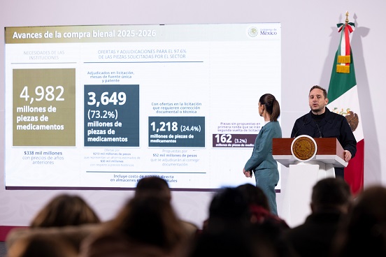 Eduardo Clark reportó que hasta el momento se tienen adjudicadas tres mil 649 mil millones de piezas de medicamentos, lo que representa el 73 por ciento de la totalidad de lo que pretende adquirirse para 2025 y 2026, por un monto de 213 mil millones de pesos, incluidos los costos de entrega directa en almacenes y hospitales.