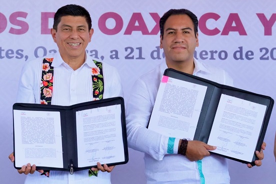 Chahuites, Oax.- En el marco de la colaboración interestatal, los Gobernadores de Oaxaca y Chiapas, Salomón Jara Cruz y Eduardo Ramírez Aguilar, respectivamente; firmaron el convenio Marco de Coordinación y Colaboración Intergubernamental de Acciones en Materia de Seguridad, a fin de promover una cultura de paz y bienestar a las comunidades limítrofes de ambas entidades.
