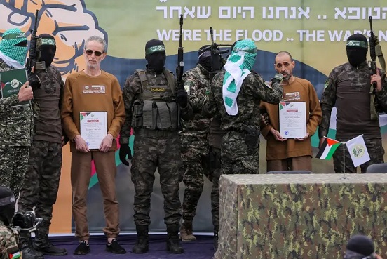 El Foro de las Familias de rehenes israelíes denunció «imágenes chocantes» durante la liberación de los tres, que pese a su evidente agotamiento, fueron obligados a hablar desde el podio por un miliciano de Hamás encapuchado y pertrechado de un micrófono.