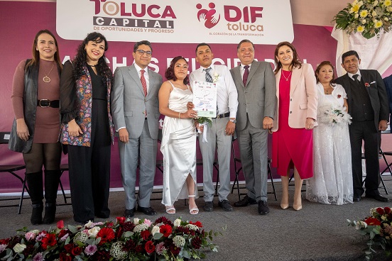 Durante la ceremonia, la Presidenta Honoraria del DIF Toluca, Rocío Pegueros Velázquez, destacó que este símbolo de alianza representa esperanza, fortaleza y crecimiento para nuestro municipio. Además, a las parejas les deseó un matrimonio lleno de amor, respeto y comprensión, con el que, a través del compromiso y amor, superarán cualquier obstáculo que se les presente.
