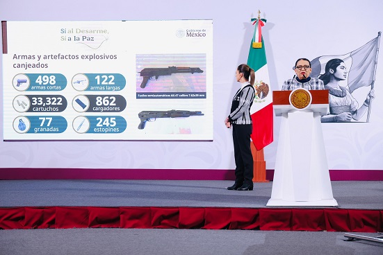 Por instrucción de la Presidenta, se continúa con la acción “Sí al Desarme, sí a la Paz”, que a la fecha ha permitido intercambiar 498 armas cortas; 122 armas largas; 77 granadas y más de 13 mil cartuchos útiles. Lo anterior desde el 10 de enero a la fecha.