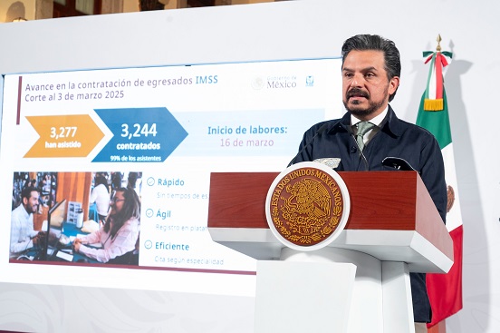 El director general del Instituto Mexicano del Seguro Social (IMSS), Zoé Robledo, informó que con el Reclutamiento de Médicos Especialistas IMSS 2025 se ha contratado, hasta el 3 de marzo, a 3 mil 244 médicas y médicos, el 99 por ciento de interesados en laborar en el Instituto.