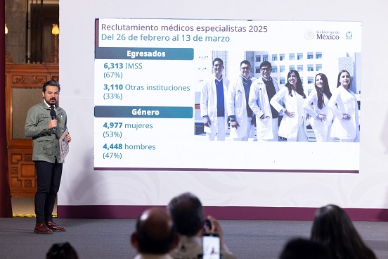 El Instituto Mexicano del Seguro Social (IMSS) contrató una cifra histórica de 9 mil 423 médicas y médicos especialistas de 70 disciplinas en la “Feria de Reclutamiento IMSS 2025”, quienes iniciaron labores el 16 de marzo, informó el director general, Zoé Robledo.