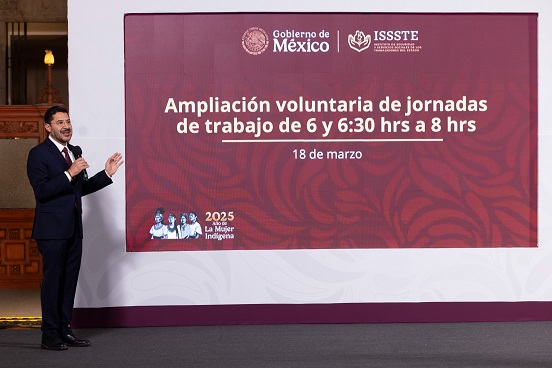 La reforma del ISSSTE (Instituto de Seguridad y Servicios Sociales de los Trabajadores del Estado) incluirá modificaciones para aumentar la jornada laboral de 6 y 6 horas y media a 8 horas, para que las y los trabajares de la salud lo apliquen de manera voluntaria, la inversión será de 3 mil 500 millones de pesos.
