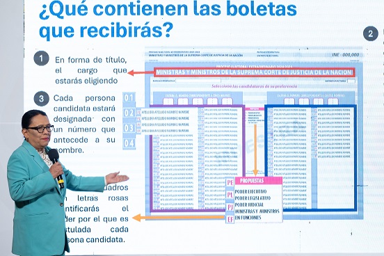 ¿Qué contiene cada boleta que se recibirá? Son aquí cuatro puntos que vamos a señalar: uno, en forma de título que está en la parte superior, ahí el cargo que estará eligiendo. En este caso, dice ministras y ministros de la Suprema Corte de Justicia de la Nación. El listado de candidaturas que se ven aquí, obvio, no tiene nombres, está ordenado alfabéticamente y dividido por género –del lado izquierdo, las mujeres y del lado derecho, hombres–. Cada persona candidata tiene designado un número que antecede a su nombre”, indicó.