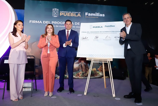 CIUDAD DE PUEBLA, Pue.- Con el propósito de otorgar alimentos nutritivos a las y los menores de edad de la entidad, y alineados con la política de vida saludable en instituciones educativas de la presidenta Claudia Sheinbaum, el gobernador Alejandro Armenta y la presidenta del Patronato del Sistema Estatal DIF, Ceci Arellano, llevaron a cabo la firma de convenio del Programa de Alimentación Escolar, para cambiar de la modalidad de desayunos fríos a calientes.
