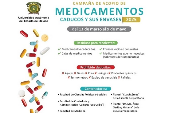 En México, alrededor del 70% de la población desconoce la forma correcta de desechar medicamentos, lo que contribuye a que cada año se generen más de 4 mil 800 toneladas de desechos farmacéuticos. Ante esta situación, la UAEMéx hace un llamado a la comunidad universitaria y a la sociedad en general para sumarse a esta iniciativa, que busca reducir el impacto ambiental y fomentar la responsabilidad social.