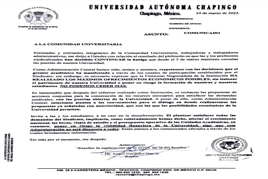 La administración de la Universidad de Chapingo advirtió que no puede ofrecer más a los académicos en huelga porque no puede poner en riesgo la situación económica de esa casa de estudios.