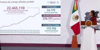 Presidenta destaca incremento del 19.7% en ingresos de enero-marzo y registro histórico de más de 22 millones de empleos formales en marzo