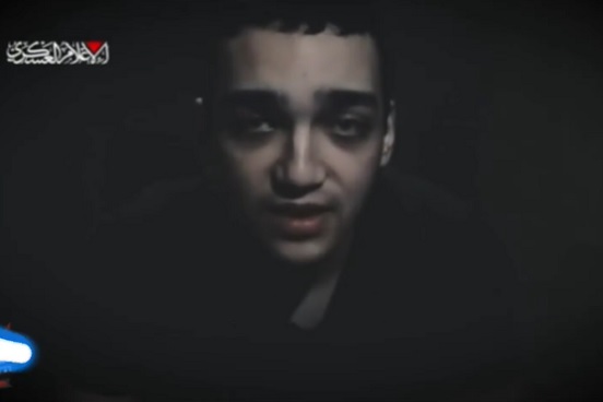El video, difundido por las Brigadas Ezzedin al Qasam, dura un poco más de tres minutos y lo muestra sentado en un local exiguo.