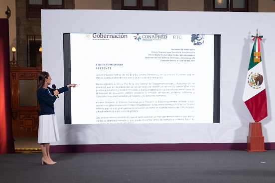 Sheinbaum también dio a conocer que en días pasados, tras diversas quejas presentadas por consumidores de los canales de televisión abierta, el Consejo Nacional para Prevenir la Discriminación, dependiente de la Secretaría de Gobernación, envió una carta a los concesionarios de los canales donde se ha reproducido el mensaje de Washington para que atiendan que se trata de un contenido discriminatorio y lo quiten del aire; sin embargo, reconoció que hasta ahora no lo han atendido.