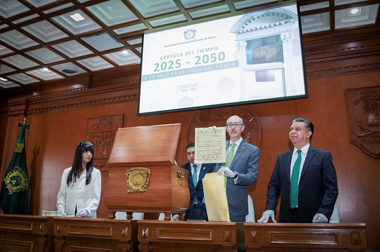En un emotivo acto cargado de simbolismo, la Universidad Autónoma del Estado de México (UAEMéx) selló su segunda cápsula del tiempo, que será abierta en abril del año 2050. La ceremonia, realizada en la Sala “Benito Juárez García” del Edificio de Rectoría, marcó un momento histórico al conmemorarse también 25 años desde la creación de la primera cápsula que resguardó la identidad universitaria en los albores del nuevo milenio.