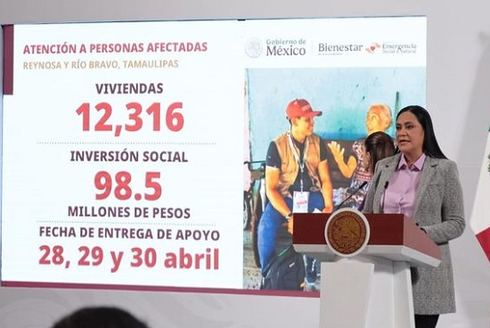 Durante la conferencia matutina: “Las mañaneras del pueblo”, que encabeza la Presidenta Claudia Sheinbaum Pardo, la secretaria de Bienestar, Ariadna Montiel Reyes, informó que, el 28, 29 y 30 de abril, el Gobierno de México entregará apoyos a familias de 12 mil 316 viviendas afectadas por las lluvias en Reynosa y Río Bravo, Tamaulipas, a través de una inversión social de 98.5 millones de pesos.