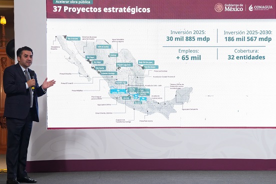 El Gobierno de México, mediante la Comisión Nacional del Agua (Conagua), desarrollará 37 proyectos de infraestructura, con una inversión histórica de más de 186 mil 560 millones de pesos (mdp), de los cuales en 2025 se destinarán más de 30 mil 880 mdp, como parte del Plan México, con el que se acelerará la obra pública para 2025 y se incrementará la soberanía alimentaria, entre otros objetivos, informó el director general de la dependencia, Efraín Morales López.