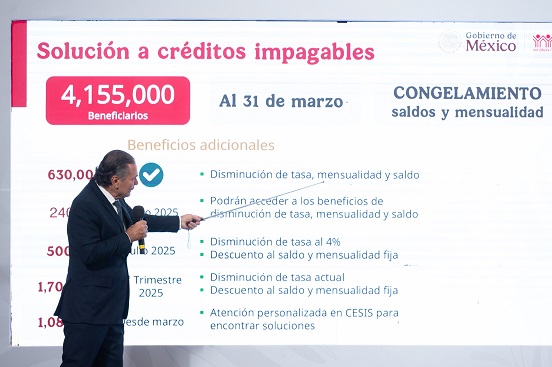 Romero Oropeza puntualizó que el Infonavit identificó 4 millones 155 mil créditos impagables que ya fueron congelados, de los que 630 mil ya están resueltos a través de disminución de tasa, mensualidad y saldo. En tanto que este mes, 240 mil créditos recibirán de manera automática beneficios como disminución de tasa, mensualidad y saldo. En julio, 500 mil créditos recibirán disminución de tasa al 4 por ciento y descuento a la mensualidad fija y al saldo. Mientas que a partir del cuarto trimestre de este año se beneficiarán a un millón 700 mil créditos, con disminución de tasa, descuento al saldo y mensualidades fijas y desde marzo, un millón 85 mil créditos se atienden de manera personalizada en Centros de Servicio Infonavit (CESI) para encontrar soluciones.