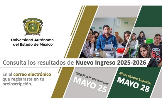 La Universidad Autónoma del Estado de México (UAEMéx) informó que los resultados de la Convocatoria de Nuevo Ingreso 2025-2026 serán enviados directamente al correo electrónico registrado por las y los aspirantes durante su proceso de preinscripción. Esta medida busca garantizar una comunicación eficaz y personalizada con quienes participaron en el proceso de admisión.