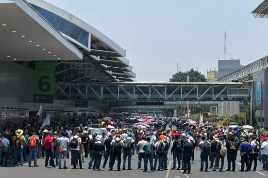 Cientos de maestros de la Coordinadora Nacional de Trabajadores de la Educación (CNTE) arribaron a la Terminal 1 del Aeropuerto Internacional de la Ciudad de México (AICM), donde avanzaron hasta la puerta número 10 para vuelos internacionales.