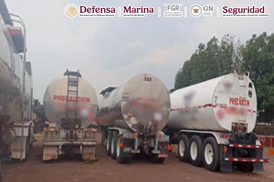 En acciones encabezadas por @GN_MEXICO_ y en coordinación con @Defensamx1, @SEMAR_mx, @FGRMexico, @SSPCMexico, @FGEGUANAJUATO y @pazgobgente, se ejecutaron cuatro órdenes de cateo en diferentes inmuebles de Guanajuato por el delito de delincuencia organizada, donde fueron detenidas 9 personas. Se aseguraron armas, cartuchos, 4 vehículos, 24 autotanques, 11 semirremolques, 7 tractocamiones y 27 mil litros de asfalto”, detalló García Harfuch.