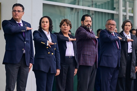 La Gobernadora del Estado de México, Delfina Gómez Álvarez acompañada de Amalia Pulido Gómez, Consejera Presidenta del Instituto Electoral del Estado de México, asistió a la Ceremonia de Izamiento de bandera con motivo del Proceso Electoral Judicial Extraordinario 2025.