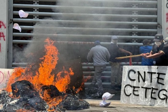 Los disidentes golpearon las puertas hasta lograr entrar y sacar objetos de las oficinas para quemarlos, mientras que a las afueras del edificio, sujetos encapuchados prendieron una fogata e incendiaron sillas, paquetería y otros objetos como parte de las protestas.