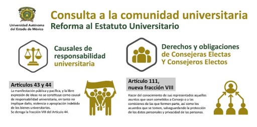 En un acto de apertura democrática y en cumplimiento al artículo 12 del Estatuto Universitario, la Universidad Autónoma del Estado de México (UAEMéx) ha puesto a consulta de su comunidad universitaria una propuesta de reforma a los artículos 43, 44 y 111 del citado documento normativo. Estas modificaciones responden directamente a las demandas contenidas en el Pliego Petitorio General del Movimiento Estudiantil y buscan fortalecer los derechos de expresión, participación y representación de la comunidad universitaria.