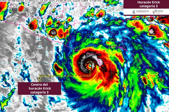El Servicio Meteorológico Nacional informa que el huracán Erick evolucionó esta tarde a categoría 3 y continúa intensificándose.