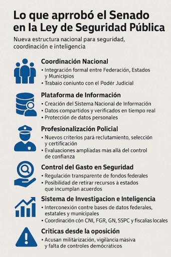 Ciudad de México.— Con 88 votos a favor y 16 en contra en lo general, el Senado de la República aprobó este lunes la nueva Ley General del Sistema Nacional de Seguridad Pública, considerada por el bloque oficialista como una herramienta para coordinar mejor a las instituciones de seguridad del país. Sin embargo, desde la oposición no tardaron en calificar la aprobación como un paso hacia la militarización, el control político y la vigilancia sobre la población.