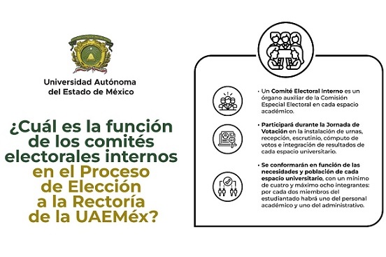 Con el objetivo de dar legalidad y legitimidad a la votación para elegir a la próxima persona titular de la Rectoría para el Periodo Ordinario 2025-2029, la Universidad Autónoma del Estado de México (UAEMéx) creó los comités electorales internos como un órgano auxiliar de la Comisión Especial Electoral.