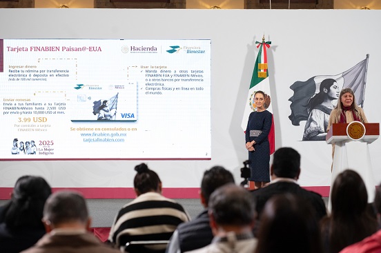 La comisión por hacer transacciones con las tarjetas de Financiera para el Bienestar en Estados Unidos bajará a 2.99 dólares a partir de mañana, informaron la presidenta Claudia Sheinbaum y Rocío Mejía, directora de Finabien.
