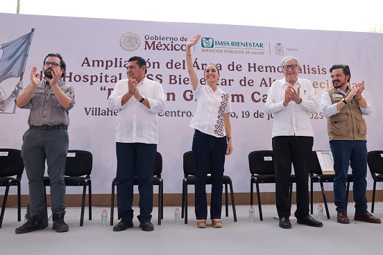 Desde Tabasco, la Presidenta de México, Claudia Sheinbaum Pardo, inauguró la ampliación del área de hemodiálisis del Hospital IMSS Bienestar de Alta Especialidad “Dr. Juan Graham Casasús” de Villahermosa y anunció una inversión adicional de 2 mil millones de pesos (mdp) para fortalecer el sistema de salud en esta entidad.