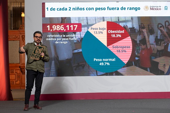 El Gobierno de México, a través de la Secretaría de Educación Pública (SEP) y del Instituto Mexicano del Seguro Social (IMSS), informaron que, a través de la estrategia Vive saludable, vive feliz, del 12 de marzo al 16 de julio, se ha valorado la salud de casi 4 millones de estudiantes de 27 mil 409 primarias públicas de todo el país, de los que, 1 de cada 2 niños tiene peso fuera de rango: 18.5 por ciento tiene sobrepeso; 18.3 por ciento tiene obesidad; 13.5 por ciento tiene peso bajo; y 49.7 por ciento tiene peso normal.