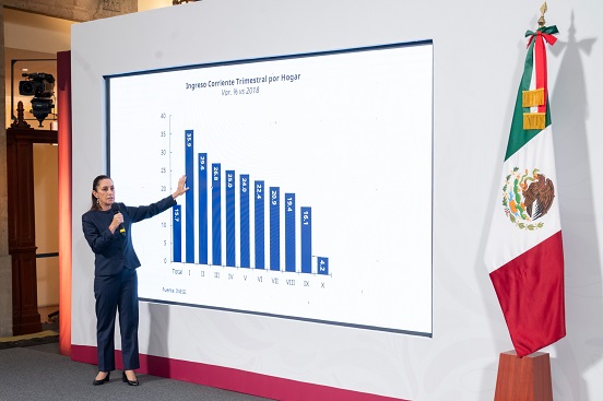“Si comparamos el 2018 con el 2024 lo que dice es que el total de las familias mexicanas incrementaron su ingreso en promedio 15.7% pero separa a todas las familias en conjuntos de diez y son los que menos ganan hasta los que tienen más ingresos, entonces lo que vemos es que el número uno es el de las familias más pobres y su ingreso entre 2018 y 2024 aumentó 35.9% mientras que las familias que más ganan, su ingreso aumentó 4.2″, explicó la mandataria.