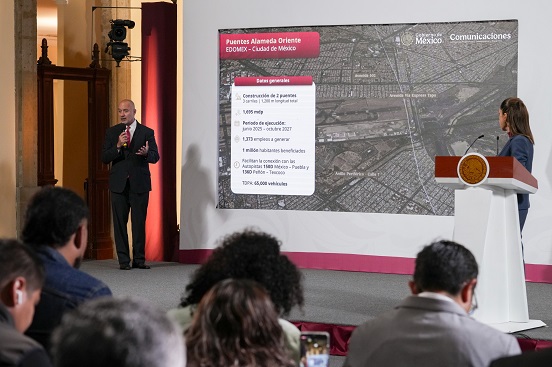 En la conferencia matutina: “Las mañaneras del pueblo”, de la Presidenta Claudia Sheinbaum Pardo, destacó que se trata de dos puentes muy importantes para la conexión entre el Estado de México y la Ciudad de México, ubicados en la Alameda Oriente, en el extremo del aeropuerto, cuyo monto de inversión será de mil 700 millones de pesos (mdp).