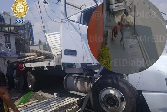 En redes sociales se compartió el momento en que una pareja y un menor de edad se salvaron de ser atropellados por un camión de carga en la alcaldía Gustavo A. Madero, el cual se estrelló contra un poste de concreto y causó varios daños materiales.