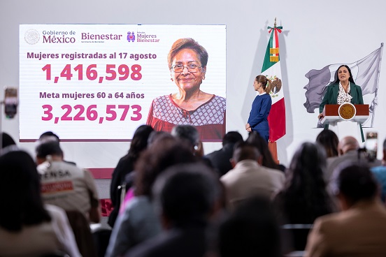 En el Salón Tesorería de Palacio Nacional señaló que, al 17 de agosto, 1.4 millones de mujeres se han registrado a la pensión en los Módulos de Bienestar, y la meta es registrar a 2.2 millones de personas en agosto de este año.