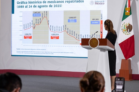 En conferencia de prensa matutina, la Mandataria federal señaló que el mayor periodo de deportaciones de Estados Unidos a México fue bajo. El gobierno de Bill Clinton, de 1993 al 2001, y en donde destacó que en el año 2000 hubo un millón 150 mil 906 de mexicanas y mexicanos deportados.