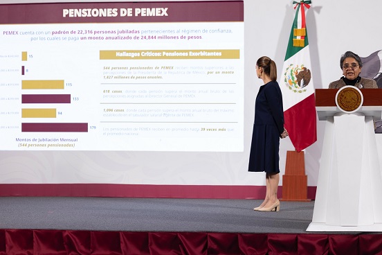 Según el Gobierno mexicano, 544 personas pensionadas de Pemex reciben montos superiores a las percepciones de la presidenta, por un monto de mil 827 millones de pesos anuales. Además, se tiene registro de 618 casos, donde cada pensión supera el monto anual bruto de las percepciones asignadas al Director General de Pemex y otros mil 96 casos donde cada pensión supera el monto anual bruto del máximo establecido en el tabulador salarial vigente de Pemex.